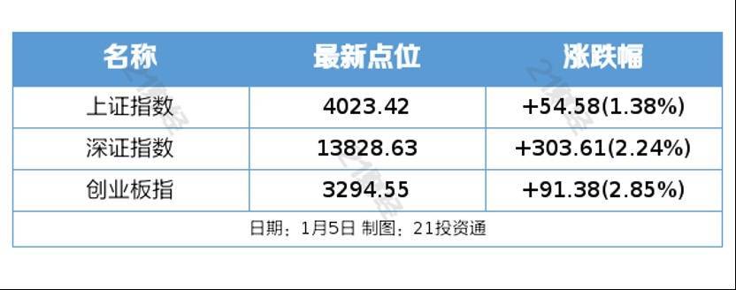 1月5日,市场高开高走迎来2026年开门红,创业板指领涨,沪指重回4000点上方,录得十二连阳。截至收盘,沪指涨1.38%,深成指涨2.24%,创业板指涨2.85%。沪深两市成交额高达2.55万亿,较上一个交易日放量5011亿。