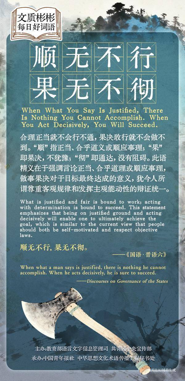 引例 顺无不行,果无不彻。(《国语·晋语六》)(言论和行为合乎情理,就不会行不通,做事风格坚决果断,就不会做不成功。)
