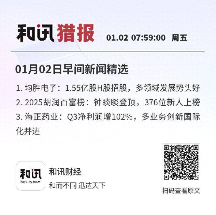 01月02日早间新闻精选1. 均胜电子:1.55亿股H股招股,多领域发展势头好2. 2025胡润百富榜:钟睒睒登顶,376位新人上榜3. 海正药业:Q3净利润增102%,多业务创新国际化并进