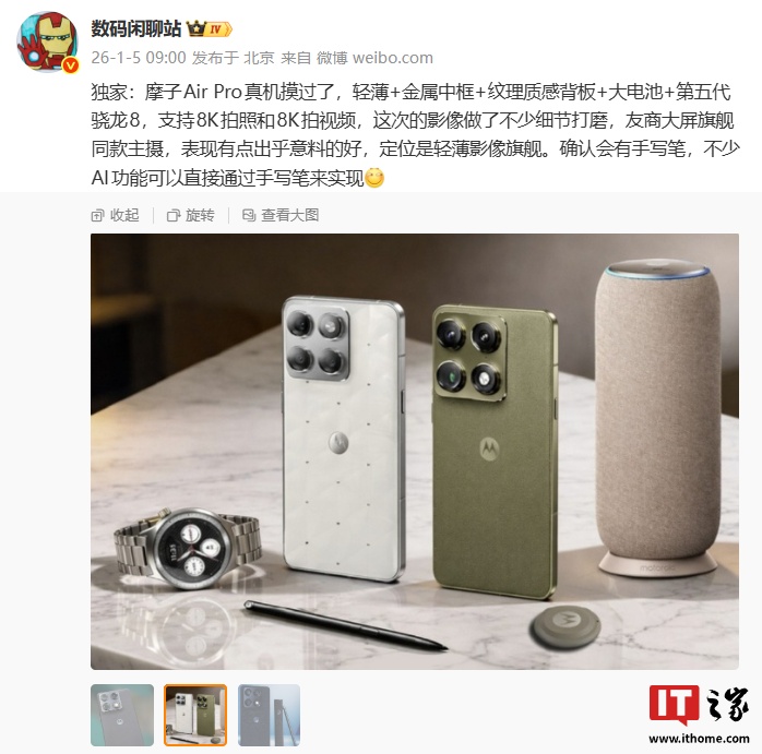 IT之家 1 月 5 日消息,博主 @数码闲聊站 今日发文透露,联想 moto X70 Air Pro 手机采用轻薄 + 金属中框 + 纹理质感背板 + 大电池设计,搭载第五代骁龙 8 处理器,支持 8K 拍照和 8K 拍视频。
